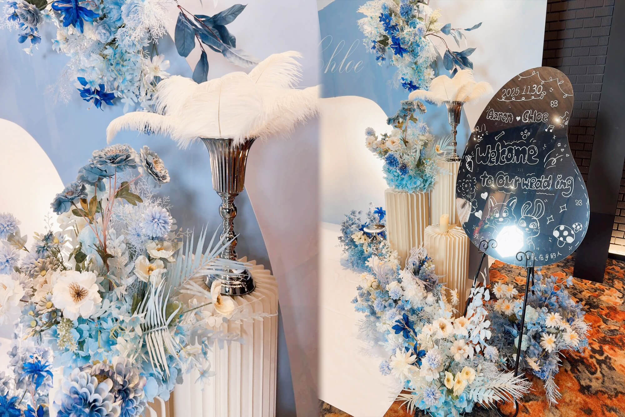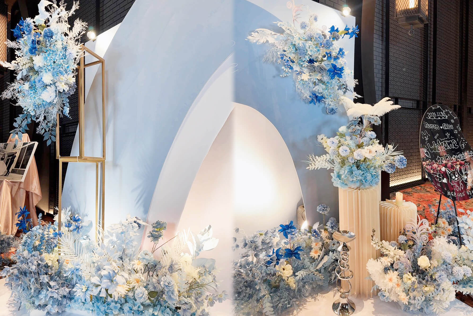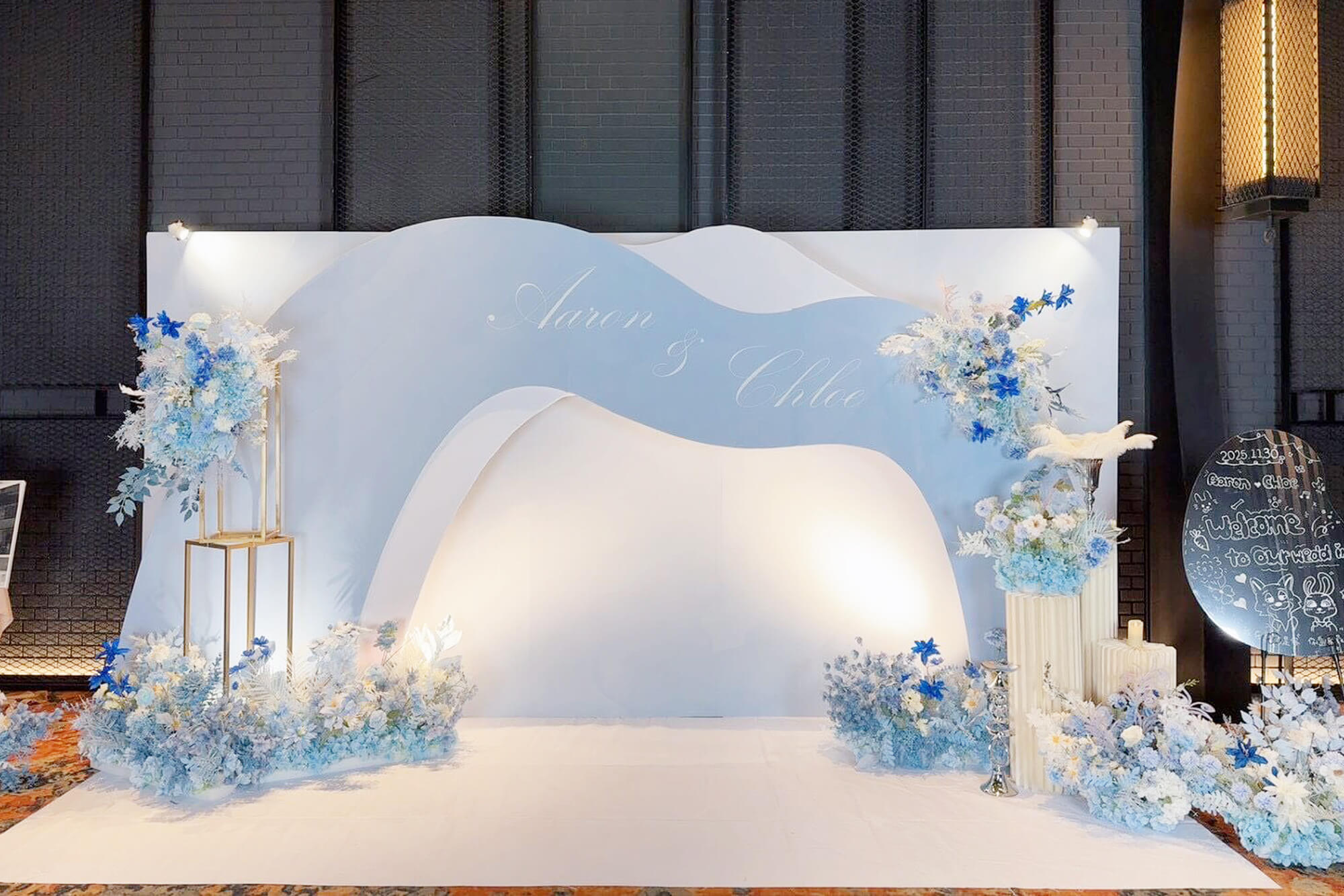 我們以 藍與白 為主軸,為新人打造一座專屬於他們的婚禮背板。